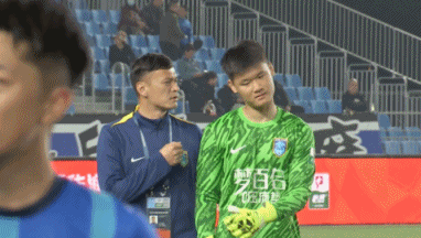 队友安慰上半场出现失误的南通门将李冠希。↓